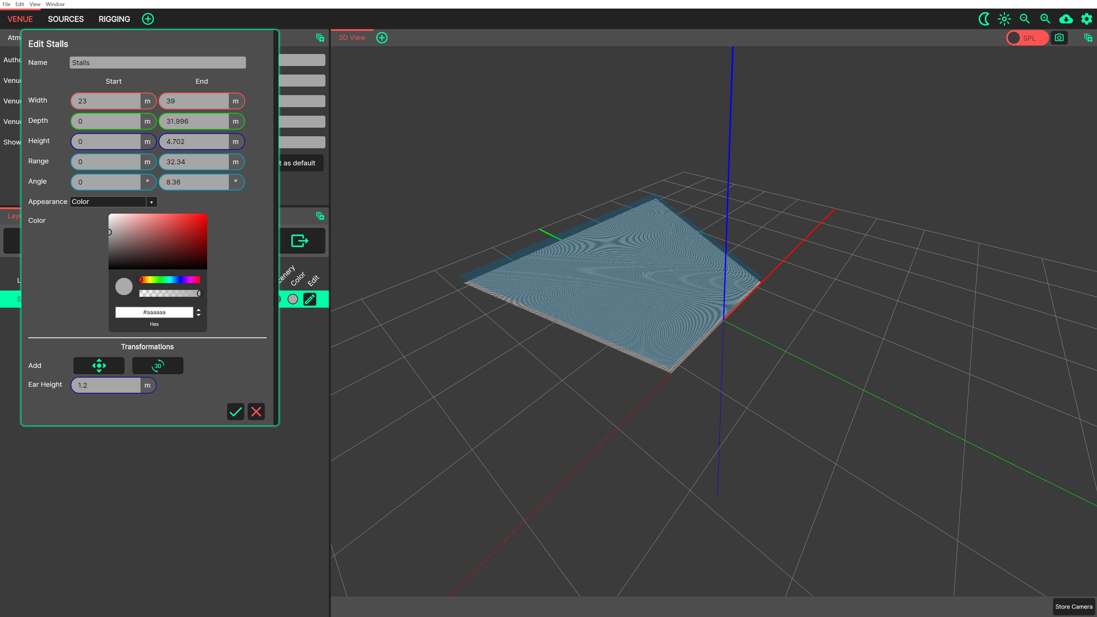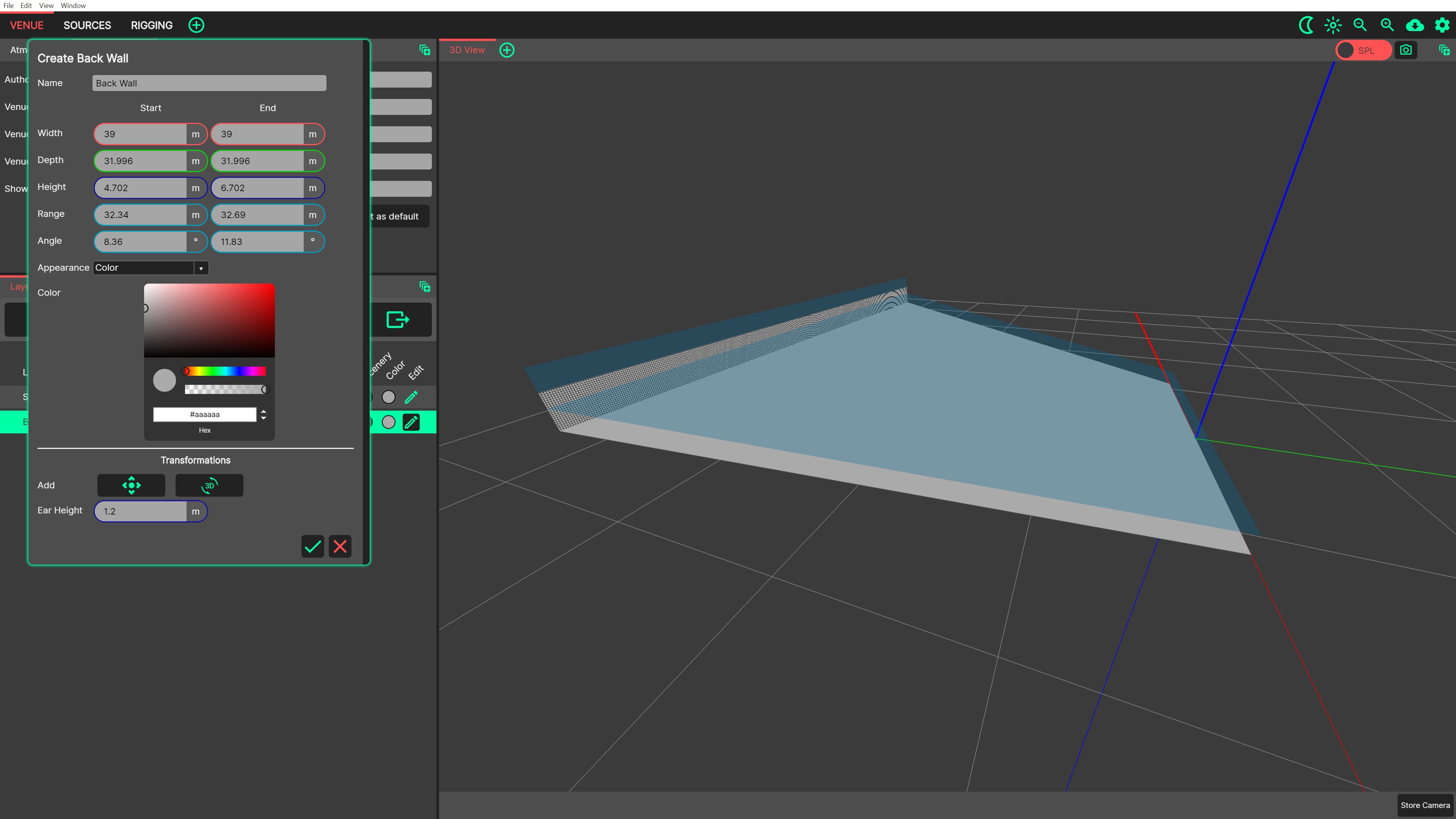 Click the source we have created in the 3D View to set is as the target for the Sideview opened earlier. The Sideview can be used to set some preliminary splay angles.