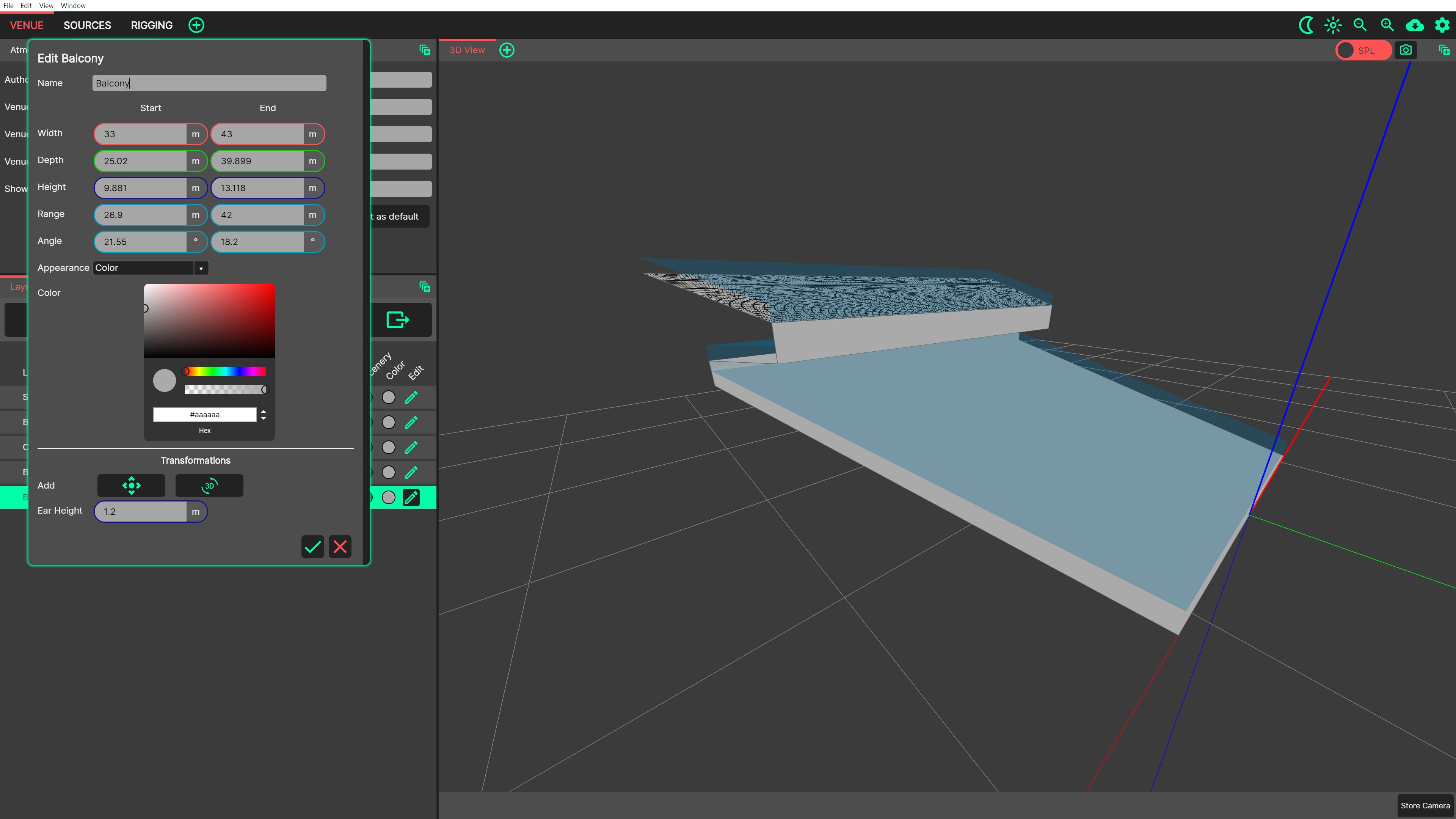 The balcony measures 33m in width at the front, closest to the stage, and 43m in width at the back. Adjust the Start and End ‘Width’ for the balcony layer, and for the balcony front and stalls ceiling created.