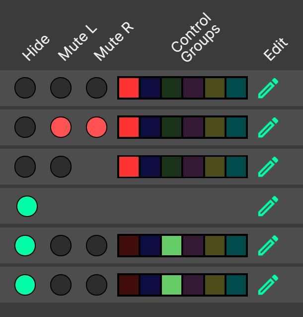 The individual sources can be added to a Control Group by selecting one of the coloured squares within the entities in the source list. When this square lights up to signify it is assigned, the parameters defined within the control group that it is assigned to will be summed with the settings contained within the source controller.
