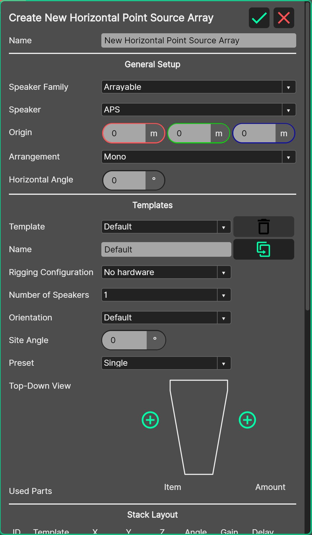 ID: The ID number within the stack layout table is the unique identifier for the entity within the table. The ID’s are labelled ‘left’ through ‘right’, with a centre entity if the ‘Number of Stacks’ is an odd number. The left and right orientation is if the loudspeakers were on the front of stage, as viewed from Front of House.